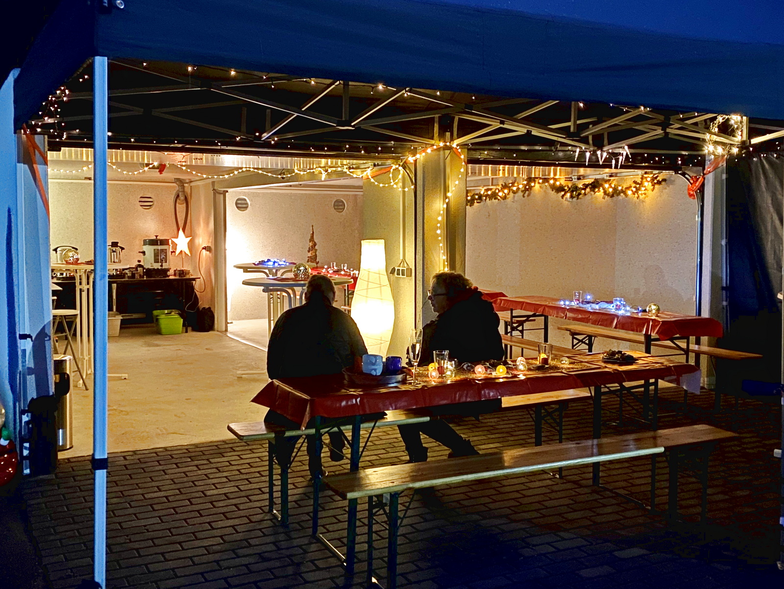 Trotz des zeitgleich stattfindenden Bundesliga-Heimspiels von Borussia Dortmund folgten zahlreiche Besucherinnen und Besucher unserer Einladung. Dem Wetter zum Trotz hatten wir eine Doppelgarage plus großem „Vorzelt“ zu einem geschützten Raum gemacht. Darin gab es ausreichend Steh- und Sitzplätze. Schnell fanden sich überall kleine Gruppen zu Gesprächen zusammen. Unser Freund Miroslaw Tybora untermalte die Stimmung mit eigenen Improvisationen auf seinem Akkordeon. Es gab Glühwein, Punsch und Kakao, Weihnachtsgebäck und andere Leckereien. Nach einer Zeit wurden Texte verteilt und gemeinsam Weihnachtslieder gesungen, was allen Anwesenden sichtlich Spaß machte. Miro begleitete den Gesang mit seinem Akkordeon. Dazwischen las Sabine Obermeit die Geschichte von den „Seltengängern“ vor. Eine lustige Gebrauchsanleitung für einen Kirchenbesuch. Auch einige Fußballanhänger kamen nach Ende des Spiels noch vorbei, um sich die Stimmung nach dem Unentschieden bei einem Glühwein etwas aufzuhellen. Eine kleine Gruppe ließ den Abend noch in Ruhe miteinander ausklingen.