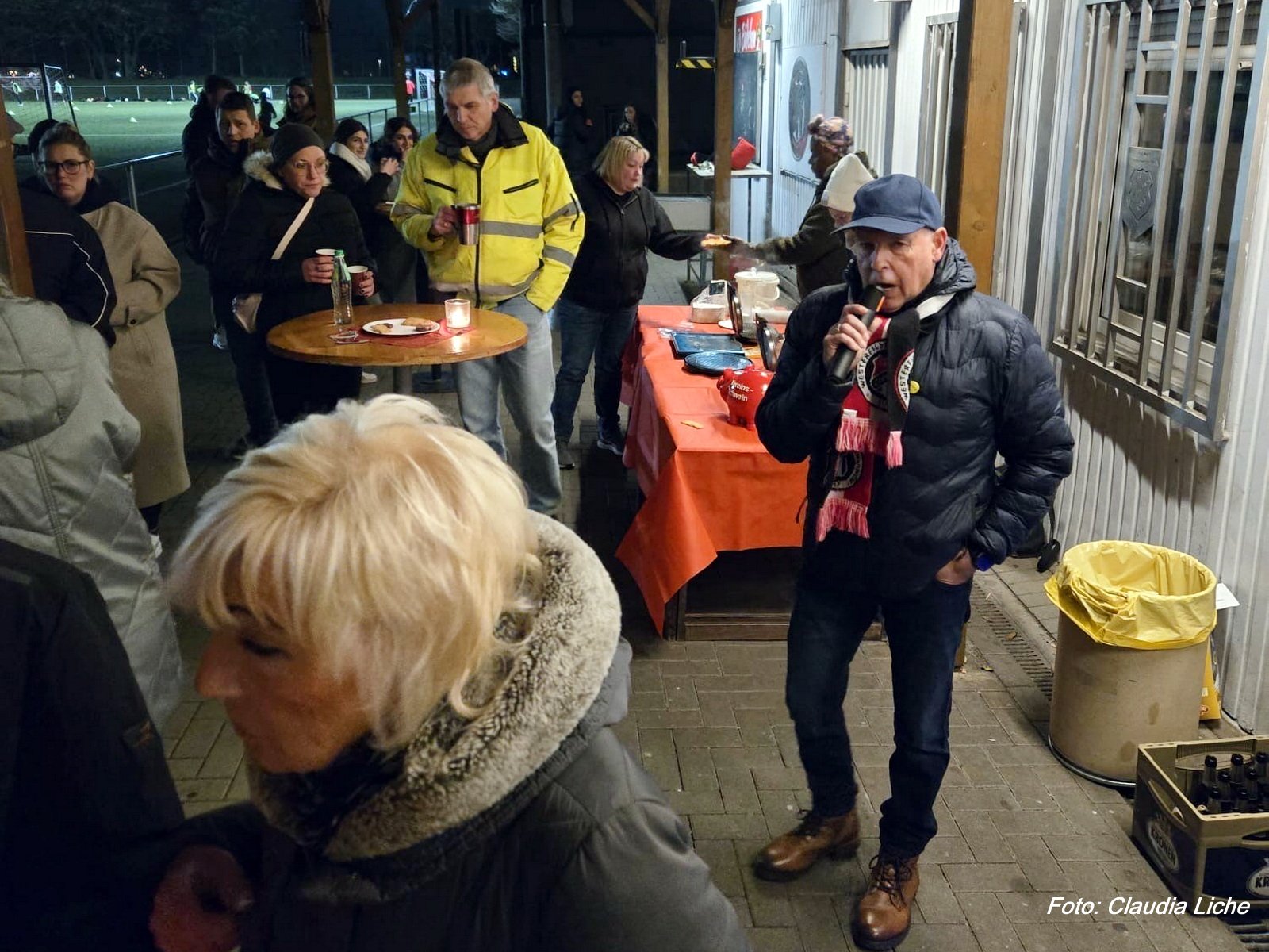 Gastgeber des fünften Türchens war der Fußballverein Rot-Weiss Germania 11/67 e.V., der auf den Sportplatz im Odemsloh in Dortmund-Bodelschwingh eingeladen hatte. Die Jugendabteilung hatte Waffeln gebacken und versorgte die Gäste mit Glühwein, Punsch und Weihnachtsgebäck. Schnell nach 18:00 Uhr füllte sich der Bereich draußen vor dem Vereinsheim. Gekommen waren junge und alte Vereinsmitglieder, aber ebenso viele Gäste „aus dem Dorf“.