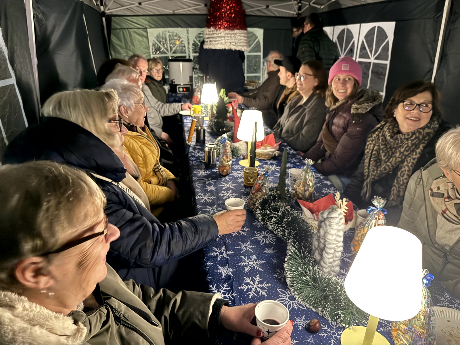 Die Besucherinnen und Besucher fanden sich schnell zu Gesprächsrunden zusammen und plauderten bei einem warmen Getränk miteinander, während im Hintergrund weihnachtliche Musik zu hören war. Das „Türchen“ war sehr gut besucht, obwohl die „alten Herren“ ausgerechnet an diesem Abend wegen einer zeitgleich stattfindenden Weihnachtsfeier gar nicht anwesend waren. Vielleicht läßt sich das im kommenden Jahr ein bißchen besser koordinieren. Trotz des kalten Wetters blieben viele der Besucher und Besucherinnen noch lange beisammen.