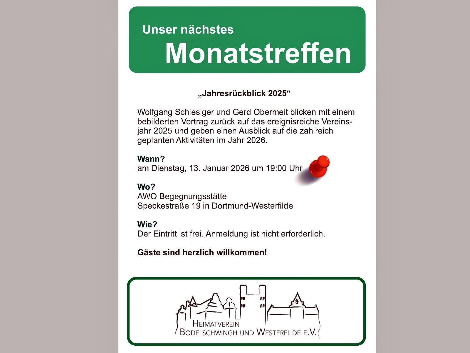 Eindrücke vom Monatstreffen am 13. Januar 2026. Rückblick auf das Vereinsleben 2025 und Ausblick auf die geplanten Aktivitäten im Jahr 2026. Konzept Wolfgang Schlesiger, Moderation Gerd Obermeit.