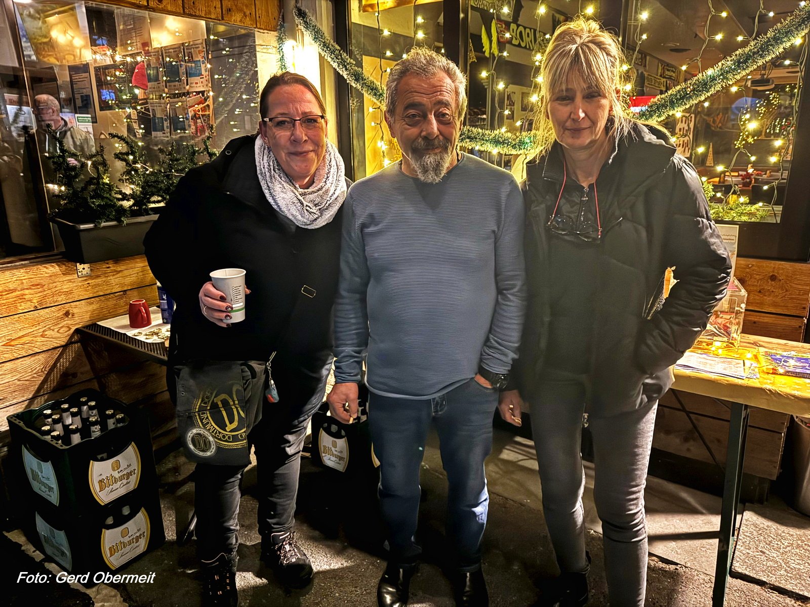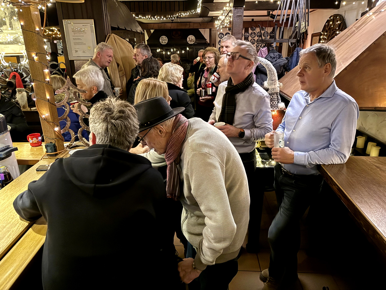 Das zweiundzwanzigste Türchen öffnete sich bei der Famile Jörg Darmochwal und Claudia Wieberg in Dortmund-Westerfilde. Auch dies war eine Premiere. Eingeladen waren die Besucherinnen und Besucher in den Garten des Hauses. Dort in der „Hütte“ war kräftig eingeheizt und der Raum deshalb schnell gefüllt. Es standen Glühwein, Tee und Plätzchen bereit. Mit der Zeit kamen mehr und mehr Gäste, so dass auch auf der Terasse und auf dem Rasen in Grüppchen zusammengestanden wurde. Draußen wärmte das Feuer in der Feuerschale.