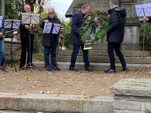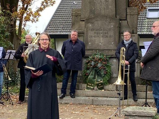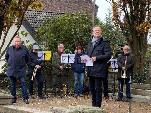 Auf dem Marktplatz ging es jetzt nur noch um das gemeinsame Erleben des lebenden Adventskalenders. Inzwischen waren vier Musiker:innen mit Blasinstrumenten gekommen, um die Besucher beim gemeinsamen Singen von Weihnachtsliedern tatkräftig zu unterstützen. Damit es textsicher geschehen konnte, waren Liedblätter unter den Anwesenden verteilt worden.