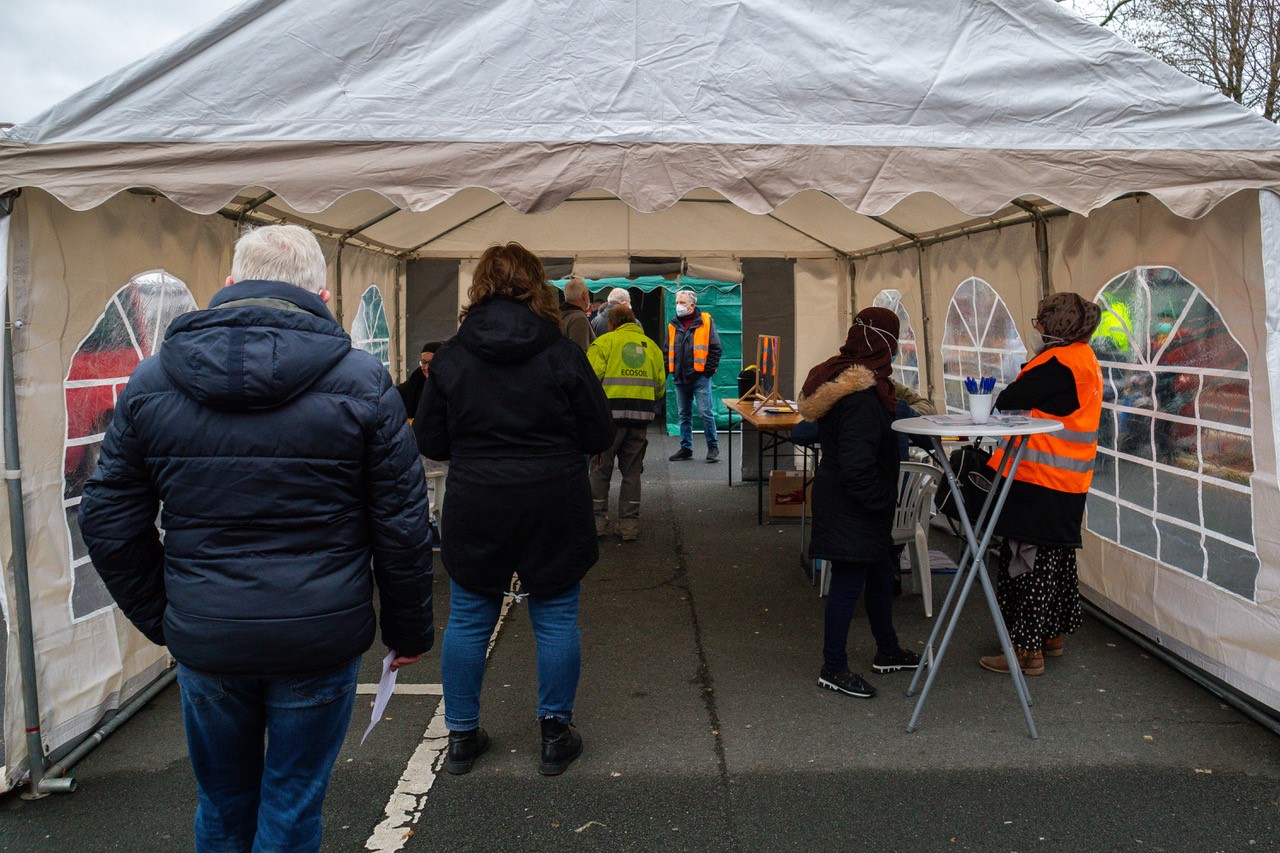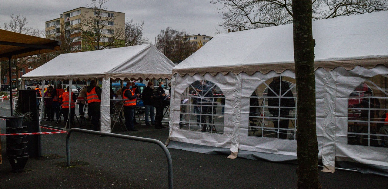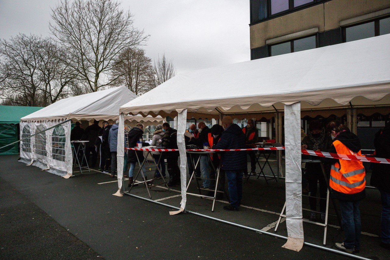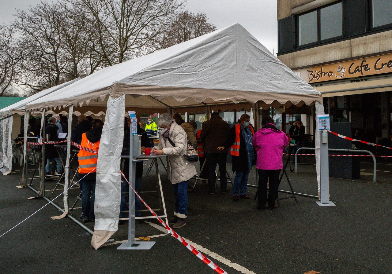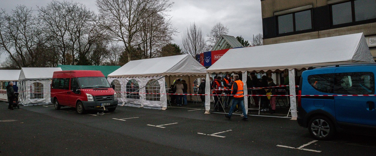Das fünfte Türchen öffnete sich vor dem Haus Gerlachweg 7 in Dortmund-Westerfilde. Eingeladen hatte die VONOVIA. Die Besucher wurden draußen in einem Zelt empfangen. Es war der erste Tag im Jahr, an dem Schneeflocken vom Himmel fielen. Das paßte natürlich wunderbar zum Anlaß. Besonders schön wirkte der mit Schnee bedeckte Tannenbaum vor dem Zelt. Durch den Schnee hindurch sah konnte man den Baumschmuck und die Lichter sehen. Ein sehr schönes Bild im Advent.