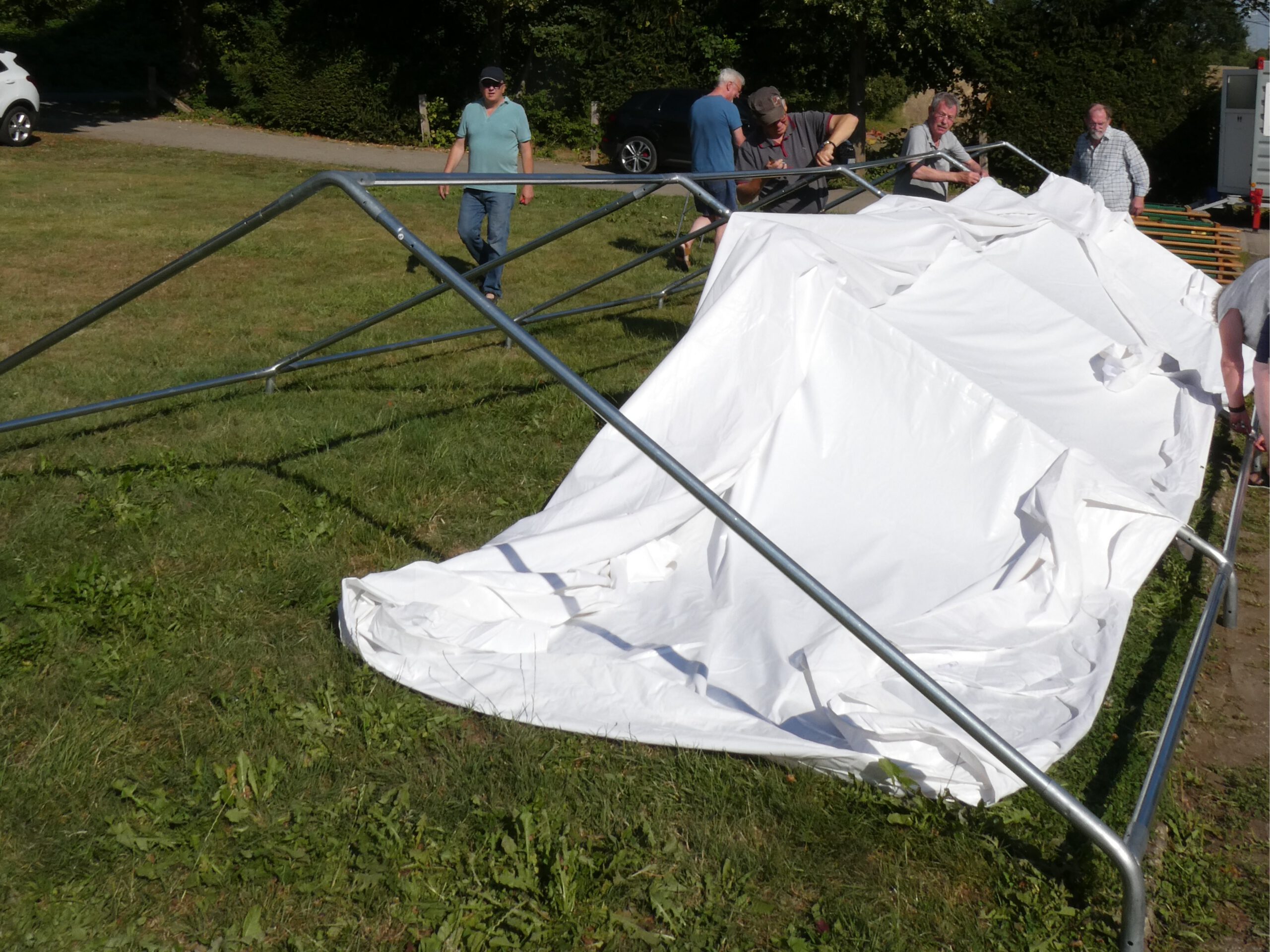 Wer ab 17:00 Uhr ein Fest beginnen will, der hat bis dahin eine Menge vorzubereiten. Schon früh um 9:00 Uhr begannen die fleißigen Hände der Helferinnen und Helfer mit der schweißtreibenden Aufbauarbeit bei heißem Sommerwetter.