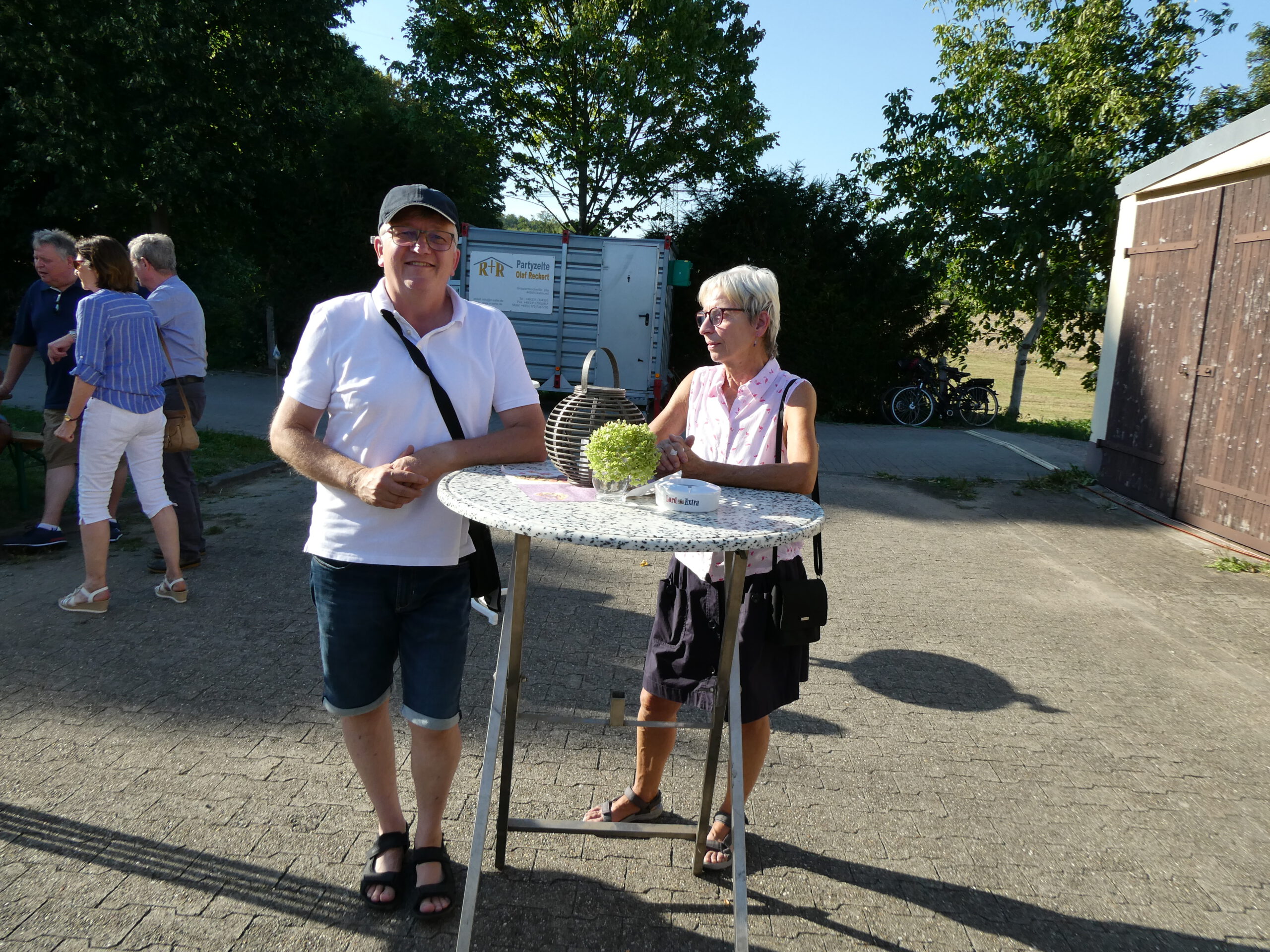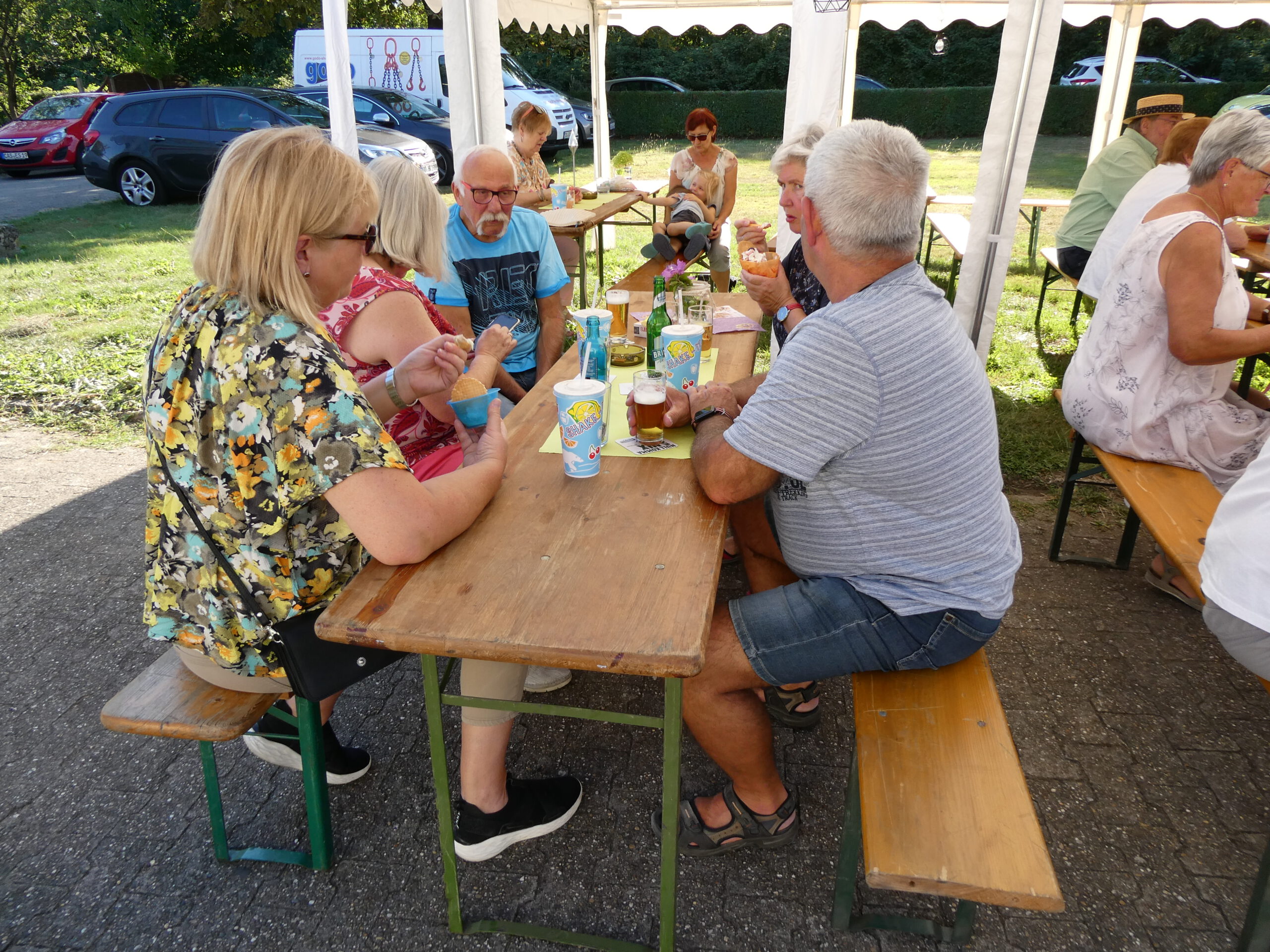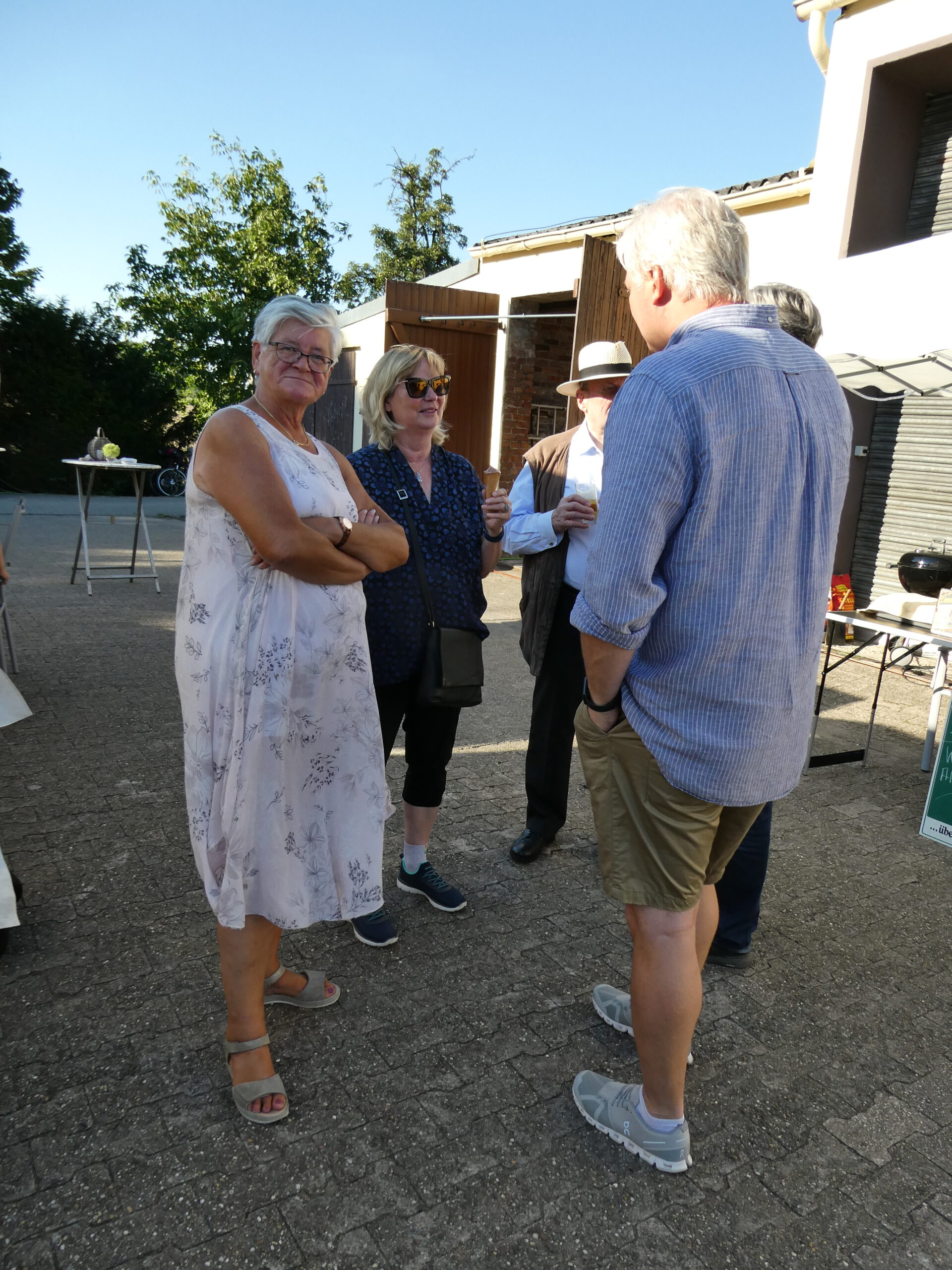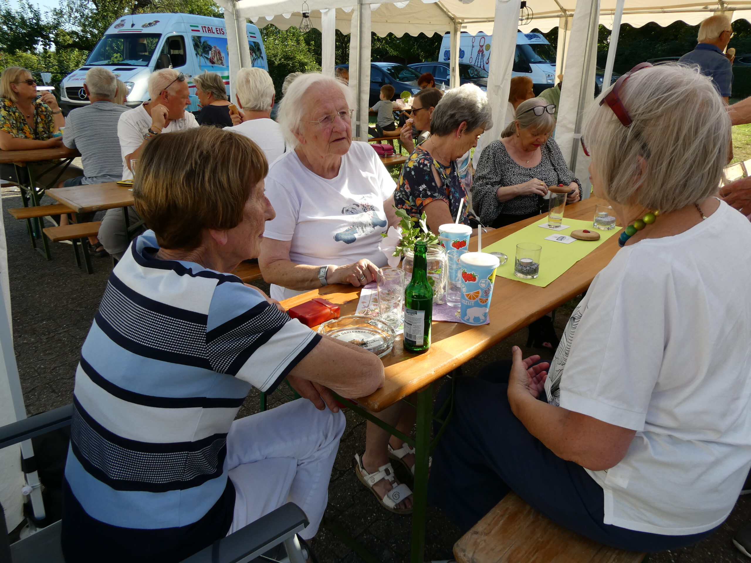 Das Fest begann gleich mit einer sehr gelungenen Überraschung. Annegret Nierhoff hatte einen Eiswagen organisiert. Der stand plötzlich um 17:00 Uhr auf dem Gelände und versorgte die Anwesenden mit erfrischendem Eis und Eiskaffee. Den Kaffee hatte Annegret schon vorher dafür vorbereitet. Bei dem warmen Wetter kam das Eis natürlich bei allen sehr gut an. Ein ganz großes Dankeschön ging an Annegret Nierhoff, die zur Feier des Tages alle zum Eisgenuß eingeladen hatte.