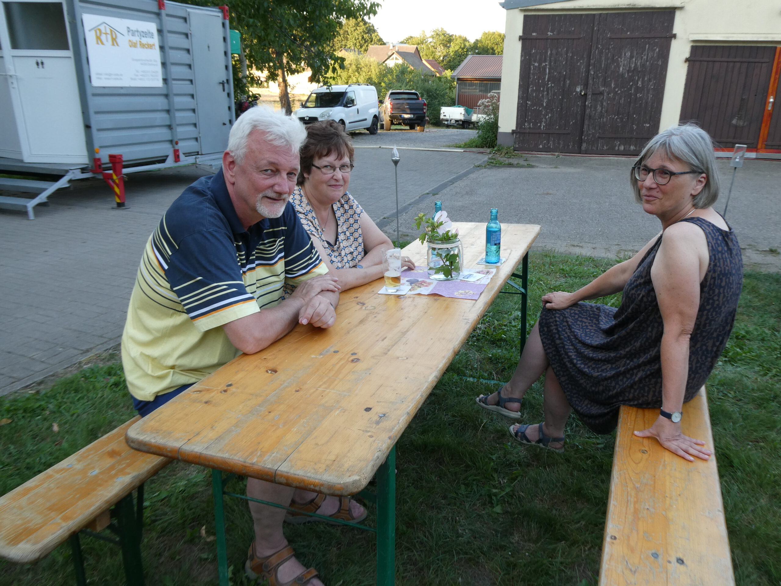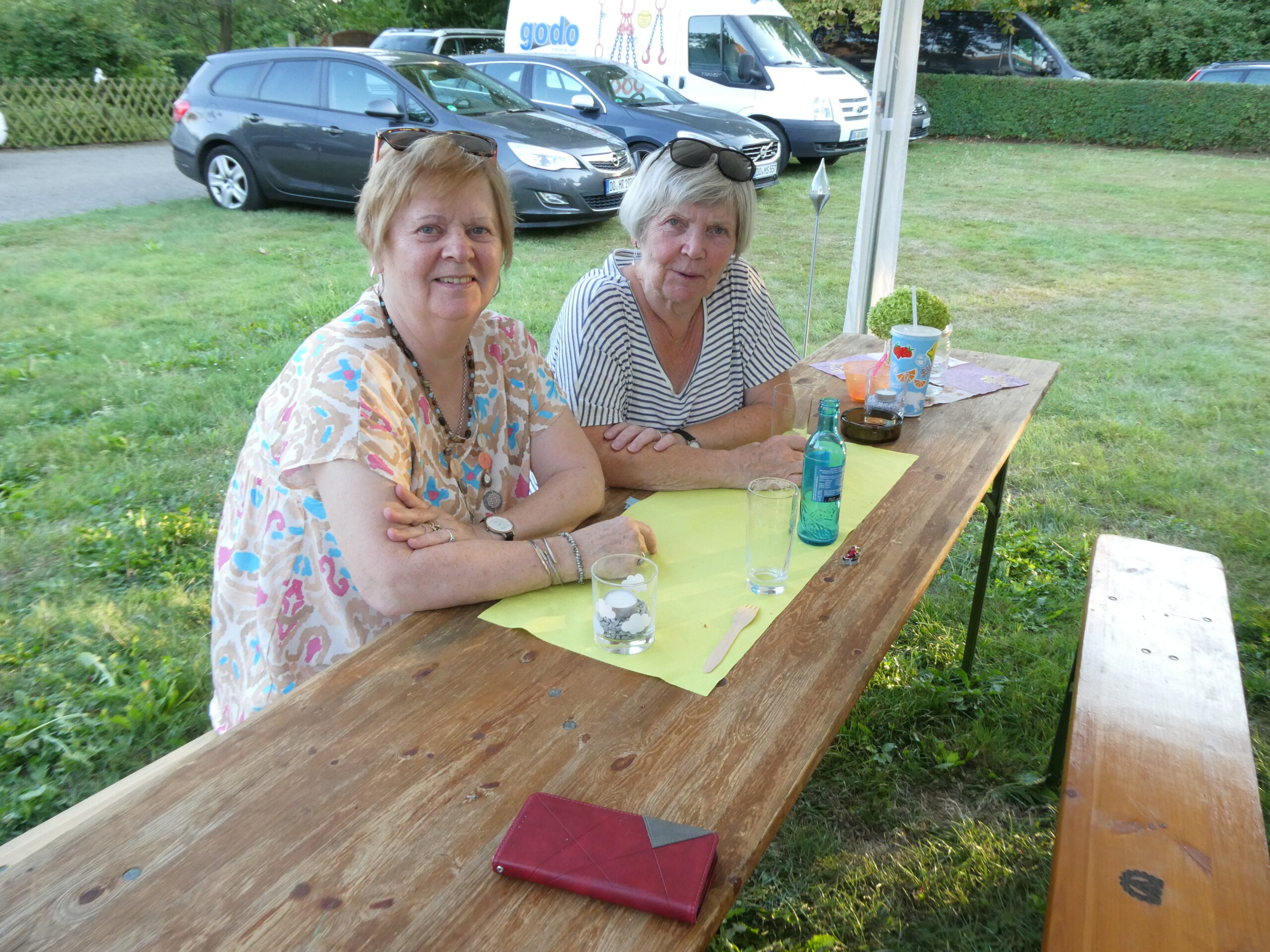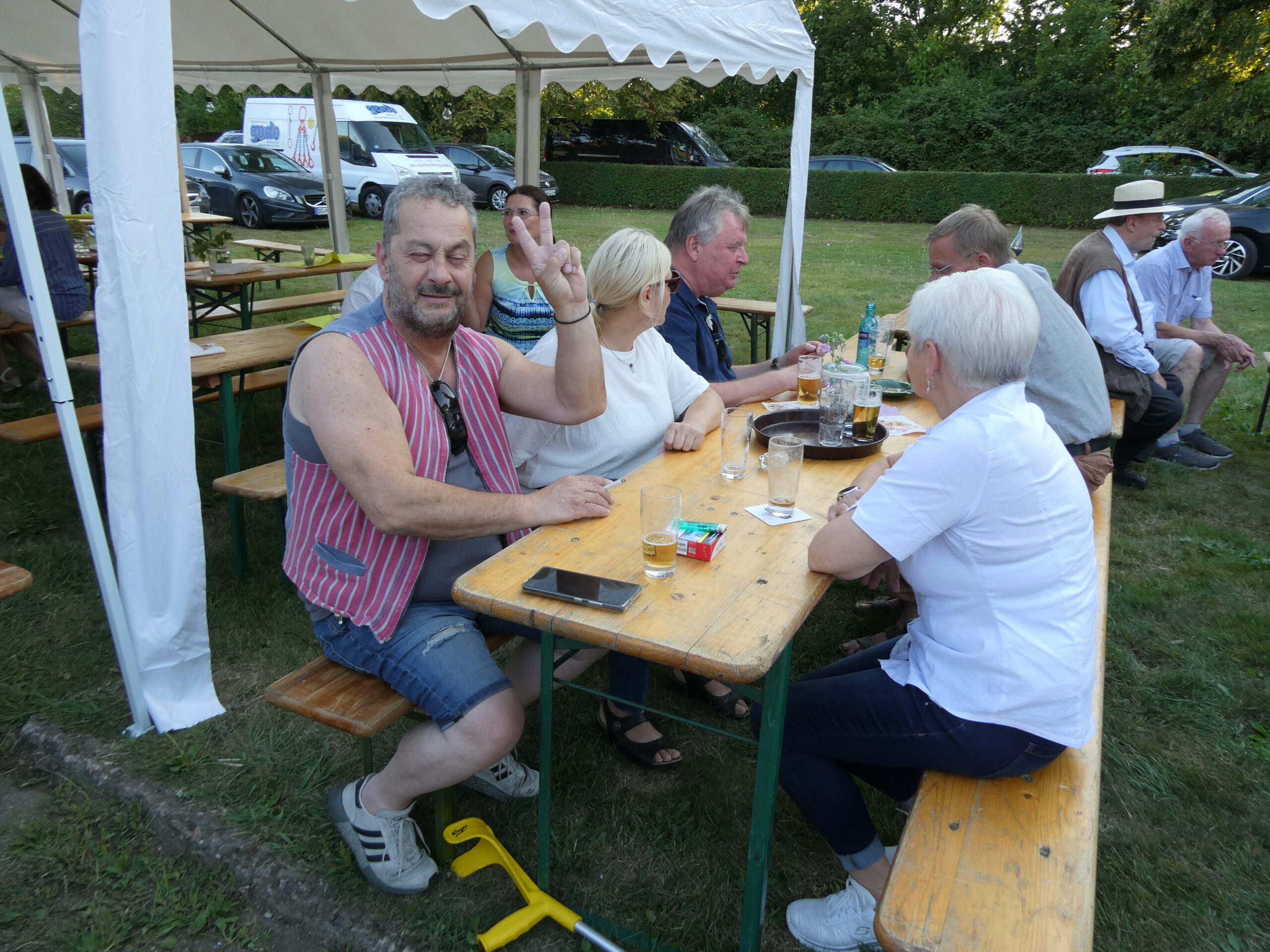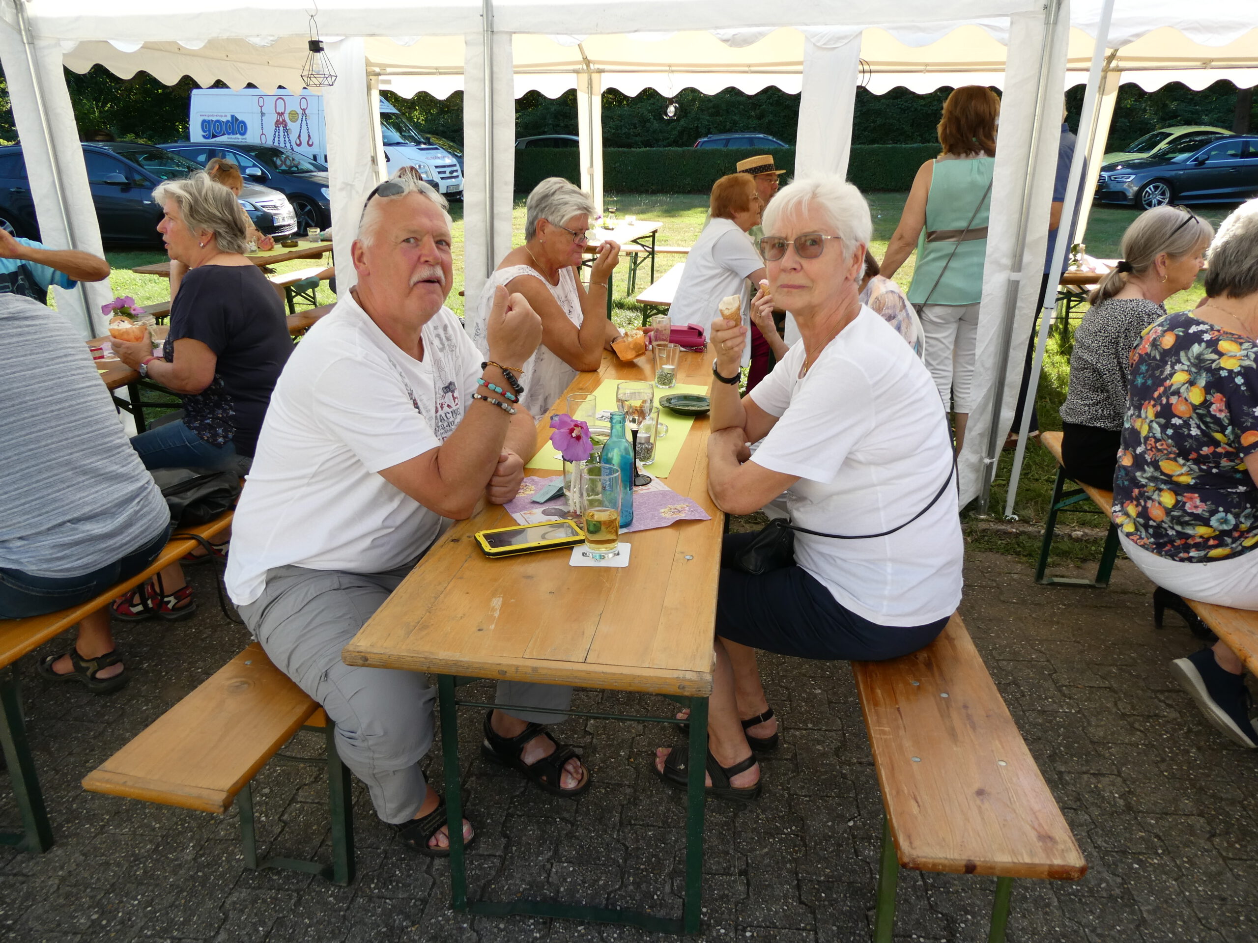 Das Fest begann gleich mit einer sehr gelungenen Überraschung. Annegret Nierhoff hatte einen Eiswagen organisiert. Der stand plötzlich um 17:00 Uhr auf dem Gelände und versorgte die Anwesenden mit erfrischendem Eis und Eiskaffee. Den Kaffee hatte Annegret schon vorher dafür vorbereitet. Bei dem warmen Wetter kam das Eis natürlich bei allen sehr gut an. Ein ganz großes Dankeschön ging an Annegret Nierhoff, die zur Feier des Tages alle zum Eisgenuß eingeladen hatte.