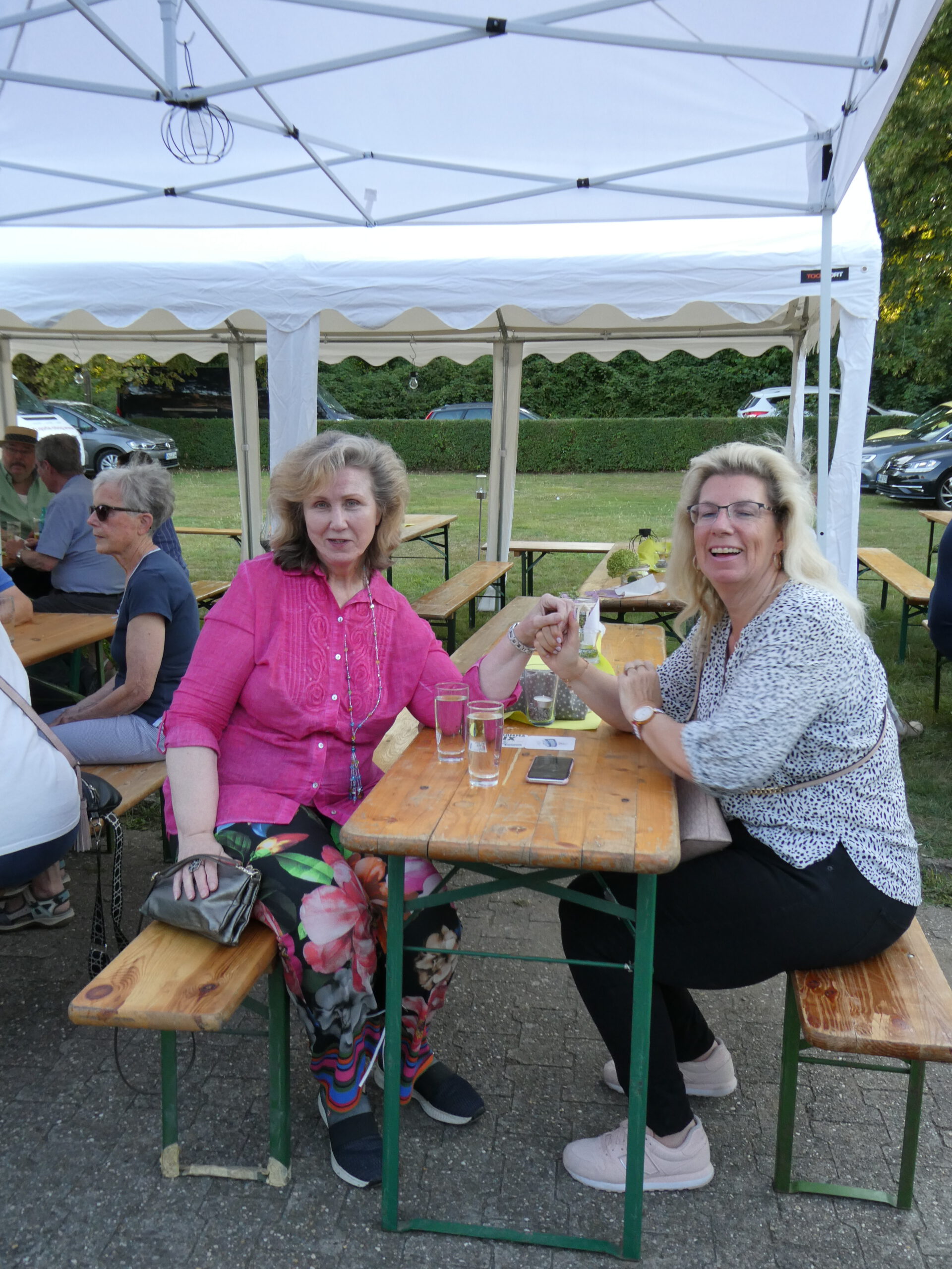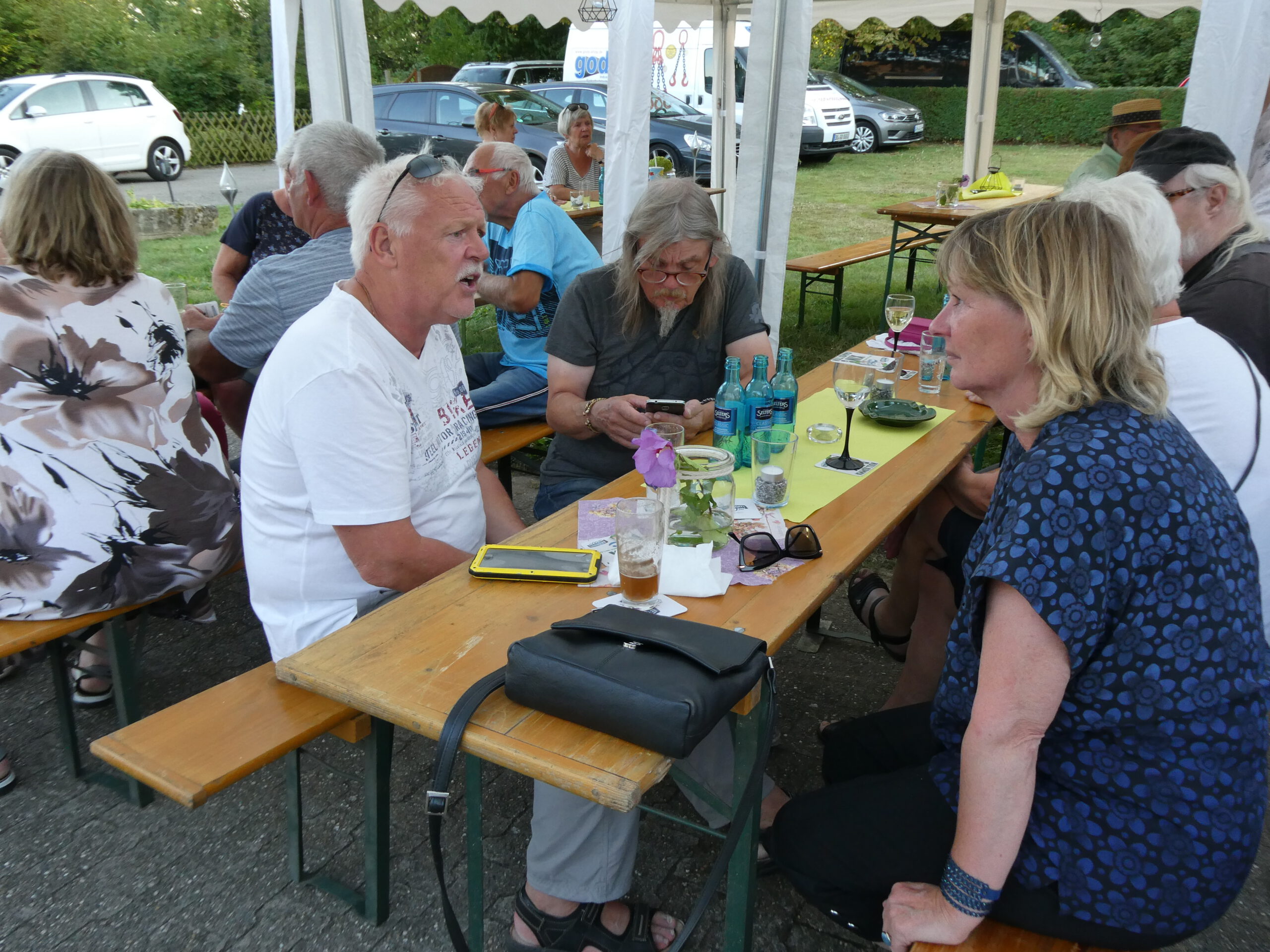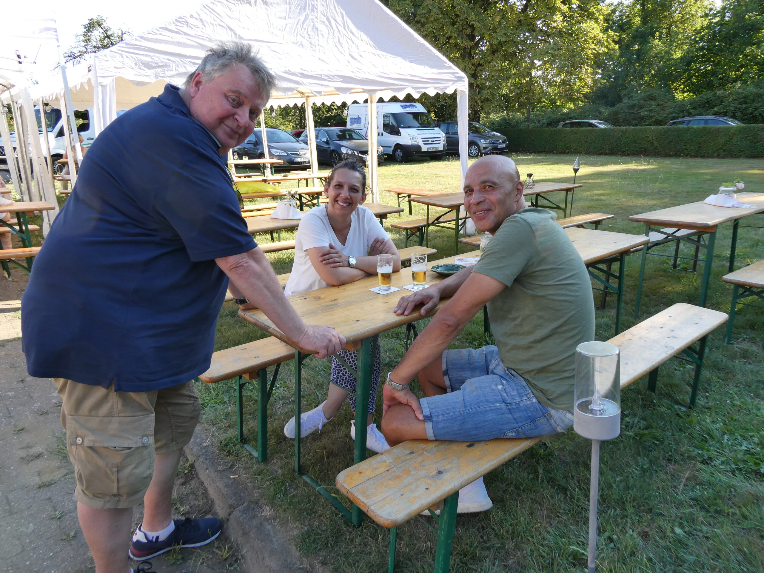Es wurden Zelte aufgestellt, Biertisch-Garnituren geschleppt, Grill und Tresen vorbereitet, der Toilettencontainer angeschlossen und eine Station für die Ausgabe der Wertmarken eingerichtet. Nachdem auch die Deko und die Beleuchtung fertig waren, konnten alle kurz verschnaufen, bis ab 16:00 Uhr die ersten Gäste eintrafen.
