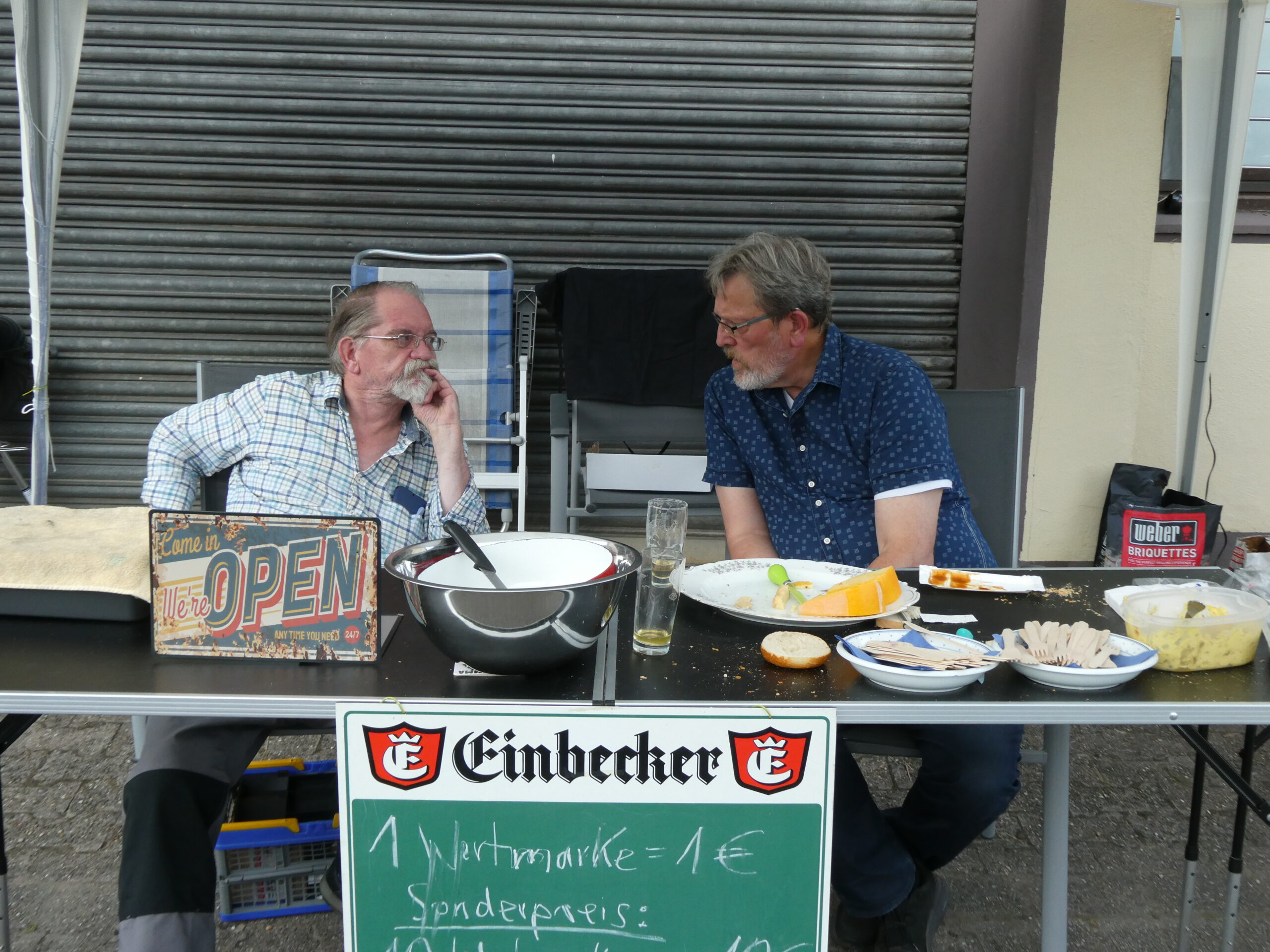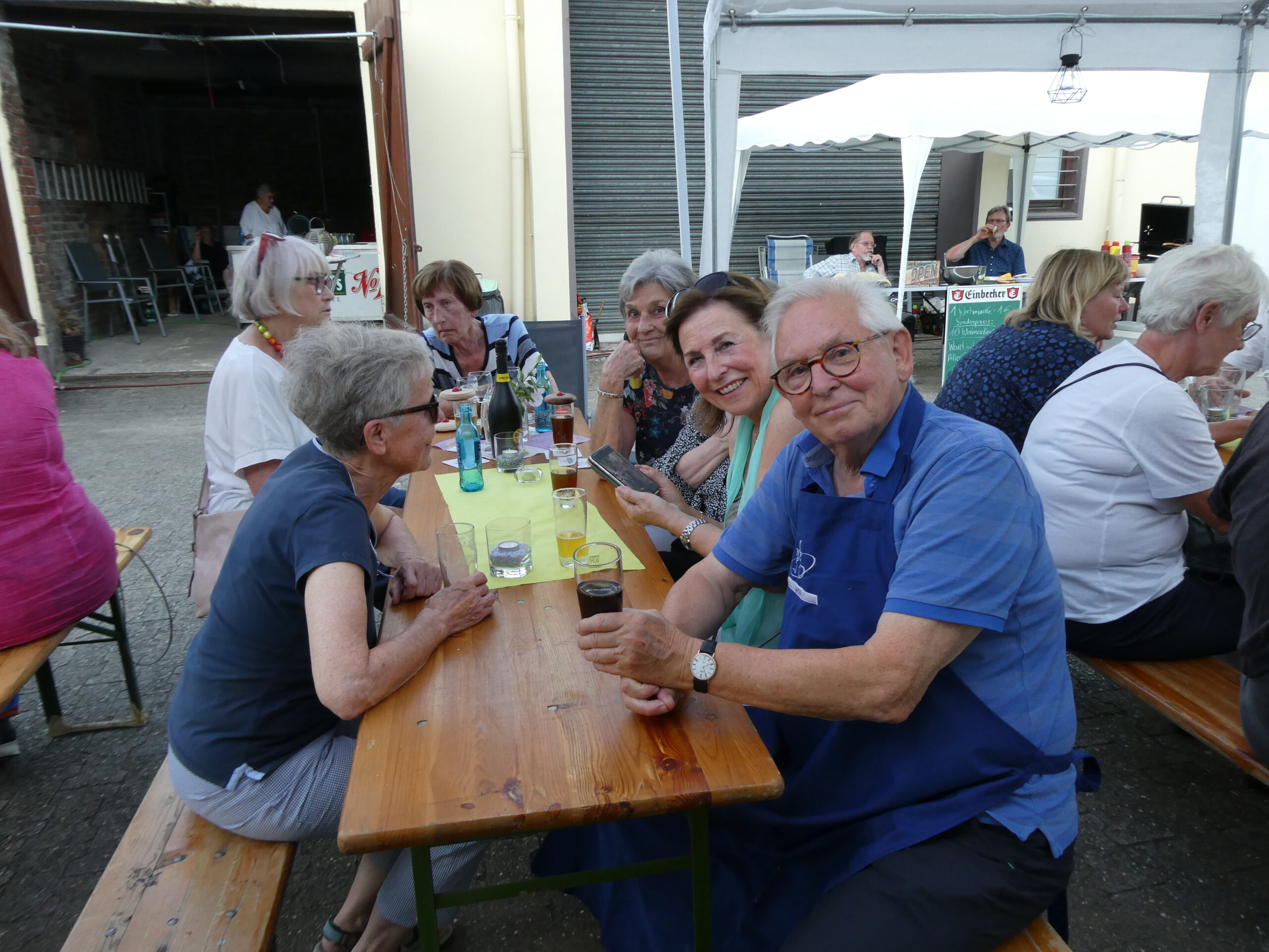 Hansi Schroeter versorgte die Besucher mit Wertmarken, Bruno Wisbar und Jan van Grondelle drehten die Würstchen. Anne Gartke und Jutta Finkemeier beackerten den Tresen und sorgten unermüdlich für flüssigen Nachschub. Andere faßten zwischendurch mit an, wenn einmal Not am Mann war.